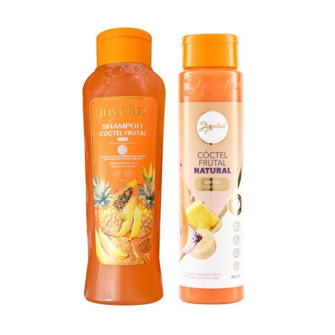 Transforma tu cabello con este dúo de reparación profunda. El shampoo cóctel frutal ayuda a restaurar el cabello maltratado o con procesos químicos, mientras que el tratamiento cóctel frutal penetra en la fibra capilar para fortalecer y devolver la vitalidad.