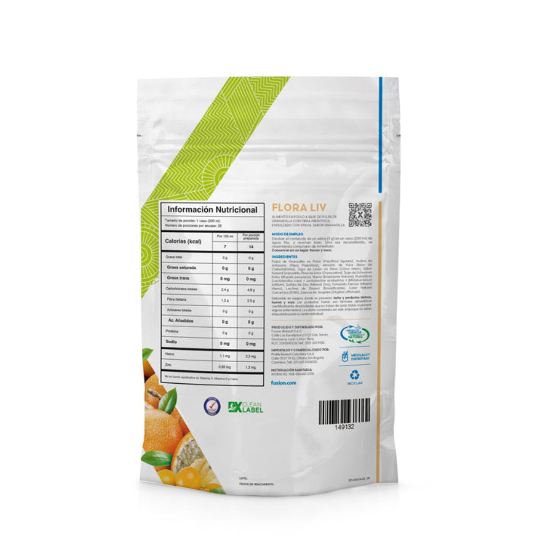 Flora Liv de FuXion es un alimento en polvo a base de pulpa de granadilla, formulado con bacterias probióticas, fibra prebiótica (inulina de achicoria) y minerales esenciales como zinc y hierro. Endulzado con stevia y con un delicioso sabor natural a granadilla, es una bebida refrescante y funcional diseñada para cuidar tu salud digestiva desde el interior.