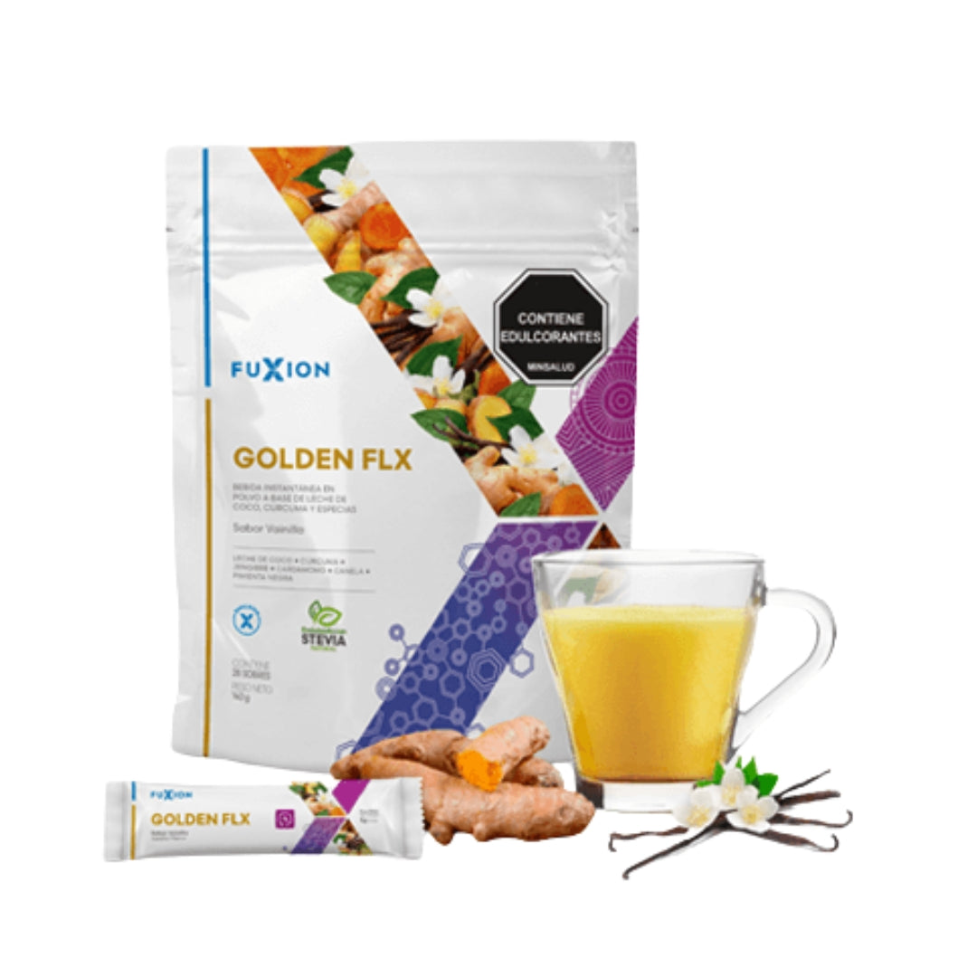 Golden FLX de FuXion es una bebida funcional instantánea inspirada en el tradicional Golden Milk, una receta milenaria de la medicina oriental. Su fórmula ha sido potenciada con extracto de cúrcuma orgánica certificada y patentada (Turmipure®), extracto de jengibre (Kión), cardamomo, canela, pimienta negra y leche de coco, logrando una combinación altamente biodisponible y deliciosa sabor vainilla.