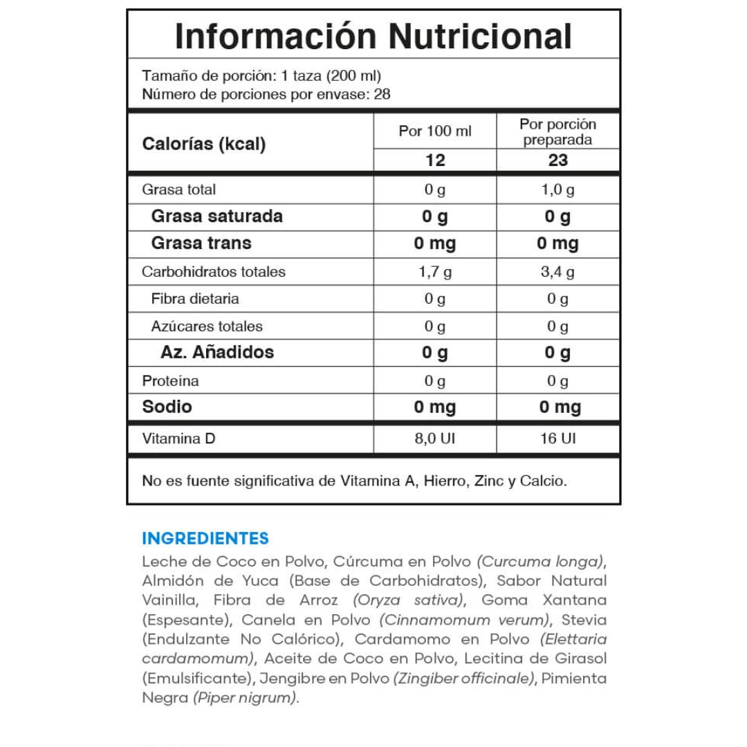 - Bebida instantánea en polvo a base de leche de coco, cúrcuma y especias.