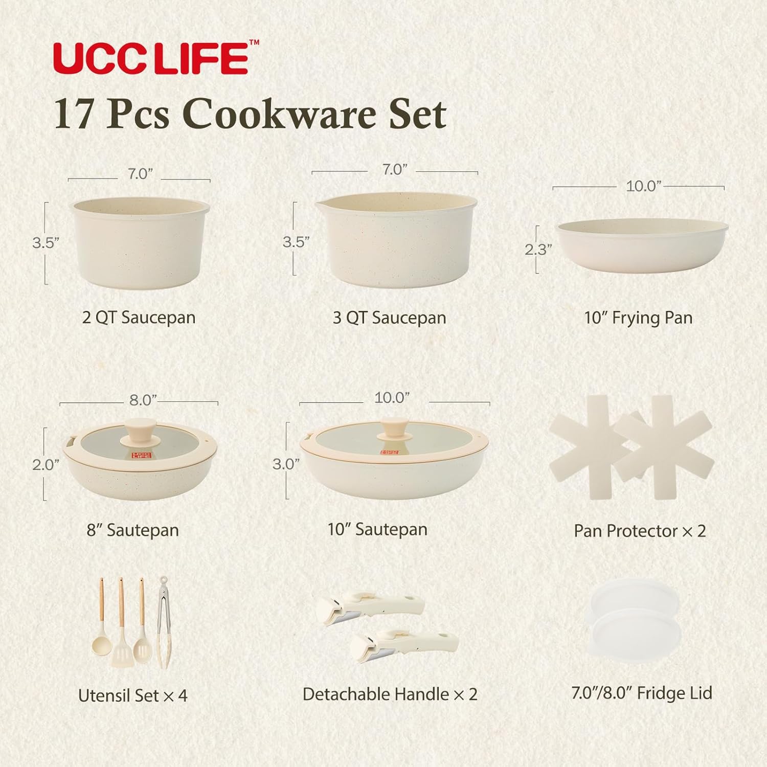 Lo que obtienes: sartén para saltear de 8 pulgadas, sartén de 10 pulgadas, sartén de 10 pulgadas, sartén de 2 cuartos de galón, sartén de 3 cuartos de galón, 4 juegos de utensilios, 2 asas desmontables, 2 protectores de sartén, 2 tapas de refrigerador.