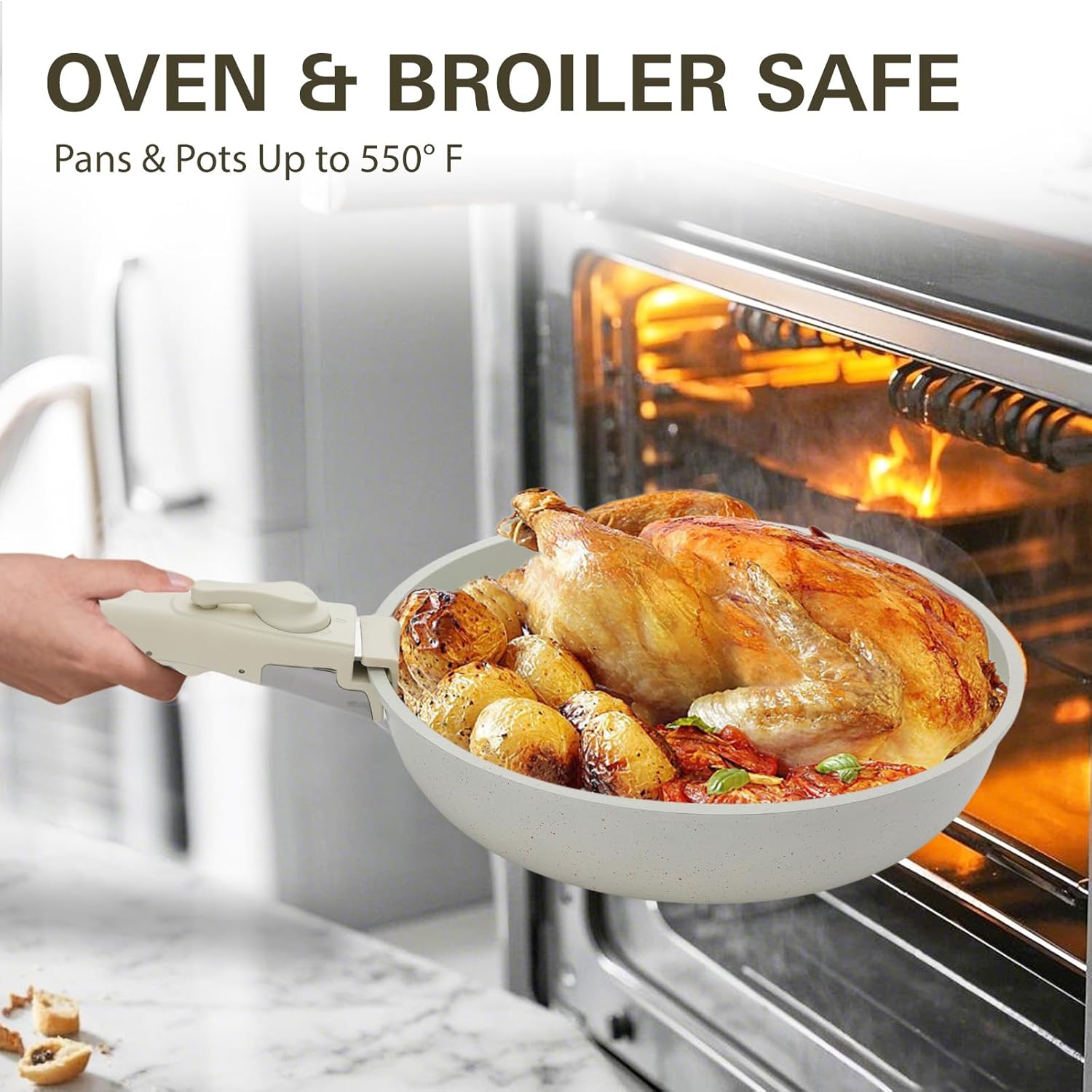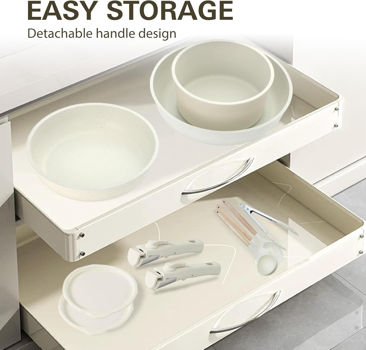 Almacenamiento sin esfuerzo: con asas desmontables y diseño apilable, extraíble con solo un toque, este utensilio de cocina ahorra un 70% de espacio de cocina cuando se almacena perfectamente en armarios o cajones, perfecto para cocinas compactas, caravanas y cámperas.