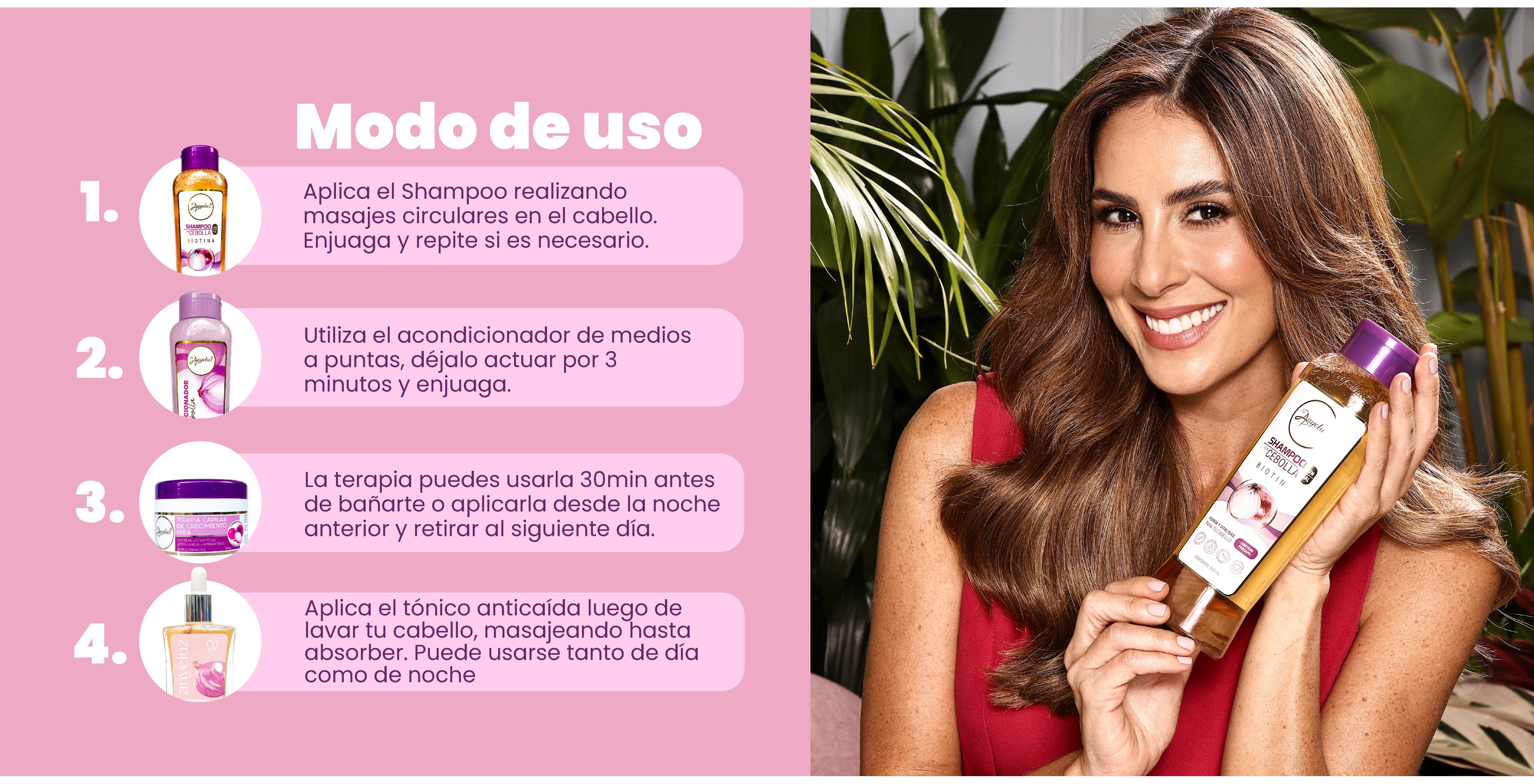 El shampoo con cebolla Anyeluz® se usa regularmente en el lavado habitual del cabello, se aplica masajeando con la yema de los dedos y se deja actuar por 3 minutos.