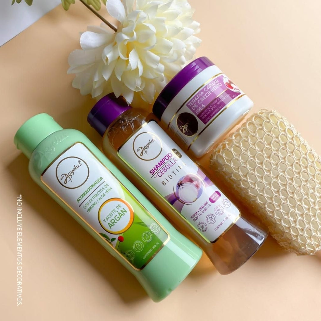 El shampoo con Cebolla (sin sales, ni parabenos), tiene en su formulación activos que promueven el crecimiento del cabello, tiene incorporado cascos cebolla natural, que por medio de un proceso de desnaturalización se elimina el olor desagradable de la misma y se logra extraer sus componentes activos que tradicionalmente han funcionado en el crecimiento del cabello. El Shampoo con Cebolla marca ANYELUZ® es el único en el mercado que trae la cebolla adentro, lo cual lo convierte en una fórmula única concentrada.