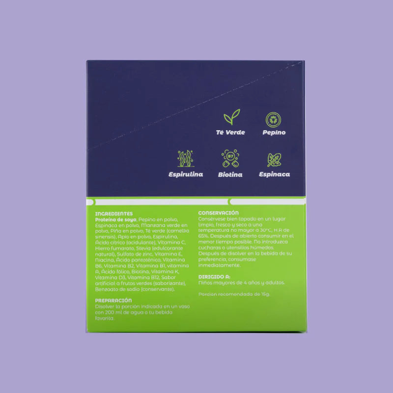 Con Té verde, Espirulina, Pepino, Apio, Espinaca, Manzana Verde, Piña y Vitaminas E, C y D.