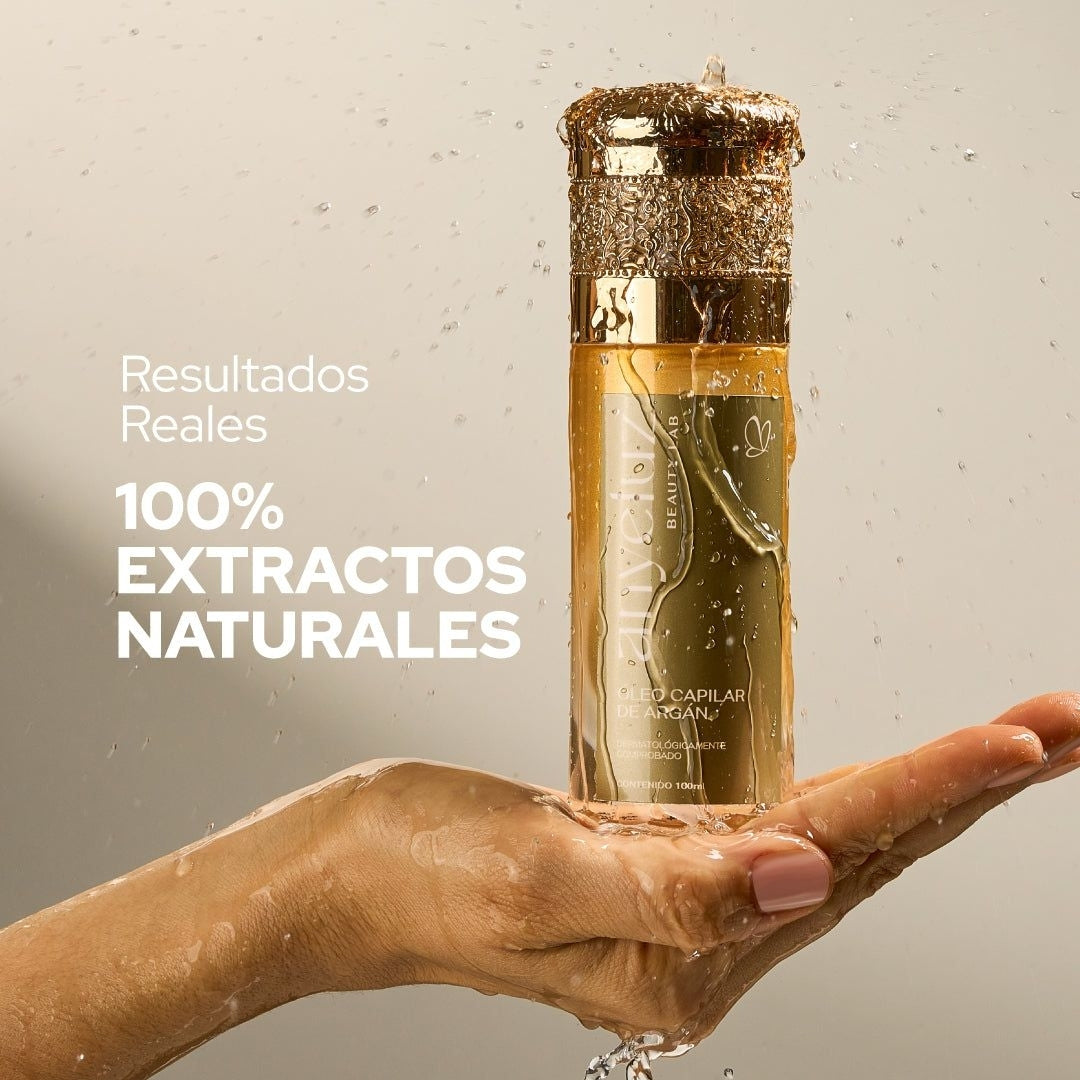 Nuestro óleo capilar de argán es oro para tu cabello, contiene una fórmula orgánica única y potencializada rica en nutrientes y vitaminas, que ayudan a la regeneración en los enlaces del cabello nutriéndolo y revitalizándolo, proporcionando brillo, suavidad y un efecto sedoso.