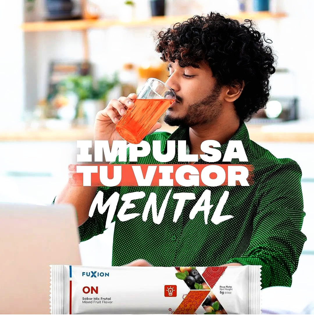 Deliciosa bebida funcional sabor mix frutal, creada por FuXion para mejorar los procesos mentales como la concentración, la memoria y el enfoque. Tienes en On un vigorizante mental para tus ratos de desgaste o fatiga.