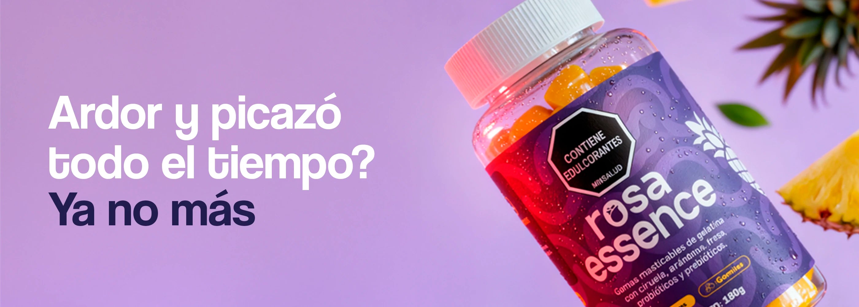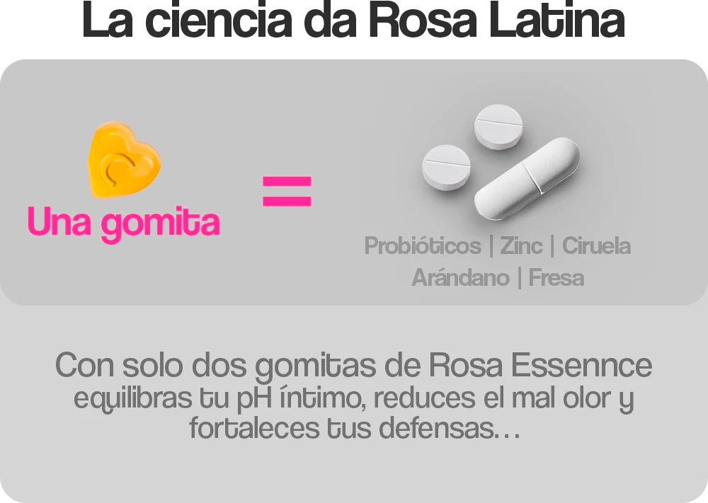 Rosa Essence es tu compañera para mantener el equilibrio natural de tu flora íntima y decirle adiós a esas molestias que interrumpen tu día. Con solo 2 gomitas al día, aportas probióticos, vitaminas y antioxidantes que refuerzan tus defensas, te brindan frescura y aumentan tu seguridad — sin complicaciones, sin tabúes.